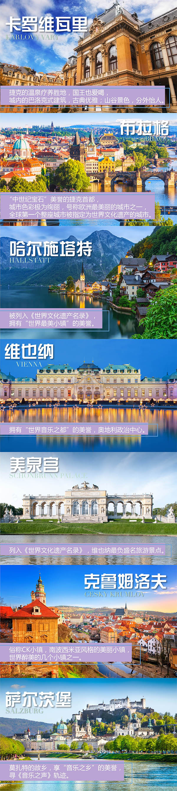 奥地利:奥地利政治中心维也纳,拥有“世界音乐之都”的美誉。曾是神圣罗马帝国、奥地利帝国、奥匈帝国和哈布斯堡王朝家族的皇宫美泉宫,如今是维也纳最负盛名的旅游景点,美泉宫及其花园被联合国教科文组织列入《世界文化遗产名录》。莫扎特的故乡萨尔茨堡,寻《音乐之声》的轨迹。