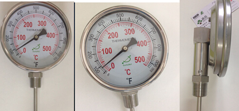 从上面的原理可以知道了吧?双金属温度计只能做到500C,所以,跟这个客户讲了一下,接受了500C的双金属温度计!