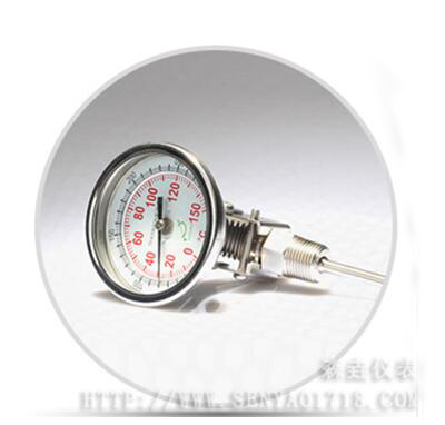 3、万向型双金属温度计,万向型双金属温度计的特点主要是它的表头和感温管的连接方式,它们是通过一根可以180°旋转的金属软管连接,这样的连接方式可以让万向型双金属温度计的表头可以90°旋转,这也是“万向型双金属温度计”的得名的原因。