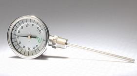 指针式温度计大多为双金属温度计,是一种测量中低温度的现场检测仪表,可以直接测量各种生产过程中的-80℃~+500℃范围内液体、蒸汽和气体介质温度。其优点是现场指针显示温度,直观方便;安全可靠,使用寿命长,结构形式多种多样,可满足不同要求;缺点是精度低,使用不够方便,显示不够直观。