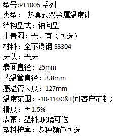 口袋式双金属温度计,使用时一般放在食物上,所以也叫食品温度计。市面上常用的型号有PT1005、PT2008、PT2005等类型都属于口袋式双金属温度计。