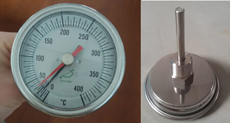 接到电话,这个客人一开口就说:你们的双金属温度计能不能直接放在锅炉里使用?而且要记录温度的最高点!乍一听,有点晕,温度计不是安装在锅炉上使用的吗?放在锅里怎么使用?最后听客人解释才知道,他的这个锅炉在设计的时候没有设计安装的接口,导致现在没有办法安装温度计测量温度,听了客人的解释后,才明白怎么一回事!原来客人是要测量锅炉内的氮气的温度,温度要达到400C的高温,要密封测量,还要记录温度计达到的最高点!最后推荐使用了如下规格的留点双金属温度计: