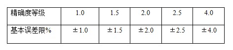 精度是表示观测值与真值的接近程度,这对测量仪表来说是一个比较重要的参数,也是衡量仪表质量优劣的重要指标之一。双金属温度计的精确度等级常用的一般是1.5,其他还有1.0,2.0,2.5,4.0。在双金属温度计国标JB/T8803-1998中有明确规定,基本误差不超过下表规定的基本误差限,基本误差以温度计量程的百分数表示。