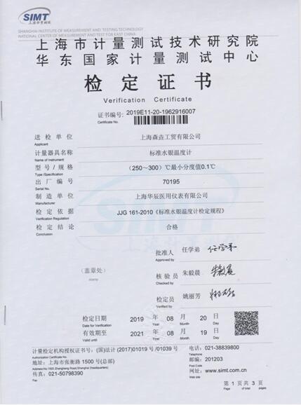 在生产过程中,校准双金属温度计等工作用温度计是一个重要工序,为了校准的准确性,对标准水银温度计的准确性要求非常重要,所以每二年标准水银温度计必须送到专业技术中心检定,得到国家计量测试中心出具的检定证书后才能运用到生产中校准双金属温度计。