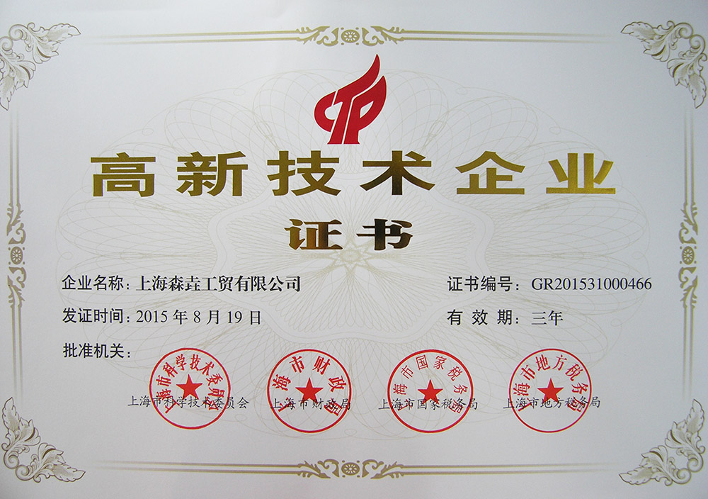 热烈庆祝我司上海森垚工贸有限公司,简称森垚仪表,荣获高新技术企业证书,并在最近刚刚拿到了实体证书,由上海市科学技术委员会,上海市财政局,上海市国家税务局,上海市地方税务局共同颁发,有效期为三年。