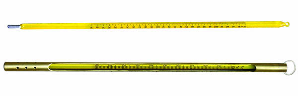 生活中我们所认知的实验室温度计,主要是整根的长玻璃棒温度计,填充液煤油或者水银等,依靠液体热胀冷缩原理测温。因其玻璃材质,必须小心轻放。