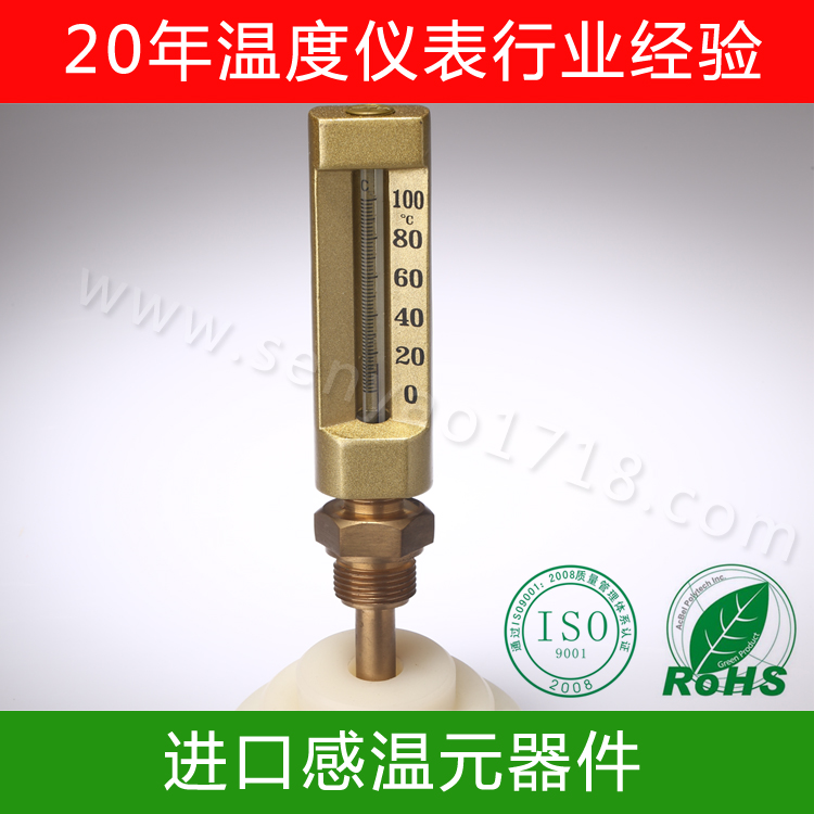 因为在船上,所以温度计也是要耐震的,V型船用温度计就是一个很好的耐震并且可以快速测出管道内液体温度的温度计。这种V型船用温度计一般分为直型和90℃角型两种,它的上体材料是铝的,经过抛光或者喷砂并且在经过阳极氧化之后呈现很好看的金黄色。其中的玻璃毛细血管种的液体一般性是煤油的,里面会加色素,呈现的颜色一般是蓝色或者红色的,而且毛细血管的得长短是可以定制的。