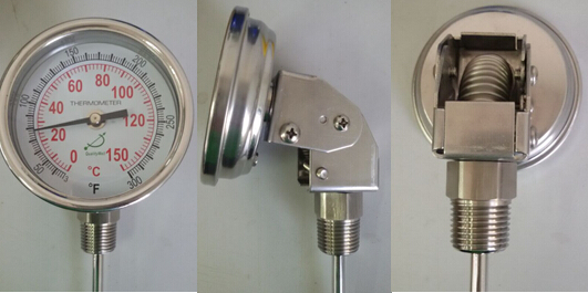 万向型双金属温度计的指针盘与保护管连接角度可任意调整。
