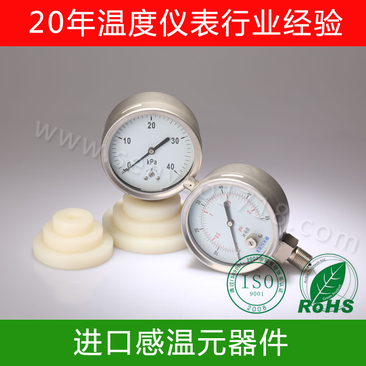 3、可采用隔膜式压力表,目前有钼2钛和钽片,膜片与弹簧管之间用甲基硅油传送压力,最小量程可做到0~100kPa,如果膜片材料还不耐腐,则可加一层F46(聚全氟乙丙烯)膜片,但根据介质的渗透性,传递液可选用氟油,则可起双重隔离作用。