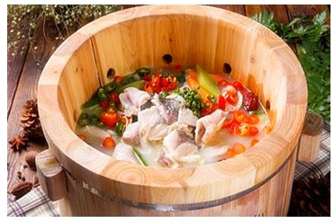 木桶鱼的制作非常的考究,一个大木桶,里面放置很多鹅软石,黑褐色的,圆圆的,鹅软石本身是经过高温烘烤的。厨师用极快刀刮取鱼片,片出的鱼片厚薄均匀,每一片都晶莹剔透,然后把切好的鱼片倒入木桶中,然后快速的搅拌,用鹅卵石把鱼片烫熟。味道是否鲜美跟鹅卵石的温度关系密切,如果温度过高,鱼片容易老,不Q弹;如果温度过低的话,无法烫熟鱼片。所以配上一款便携式的食品温度计就可以让美味不变味。